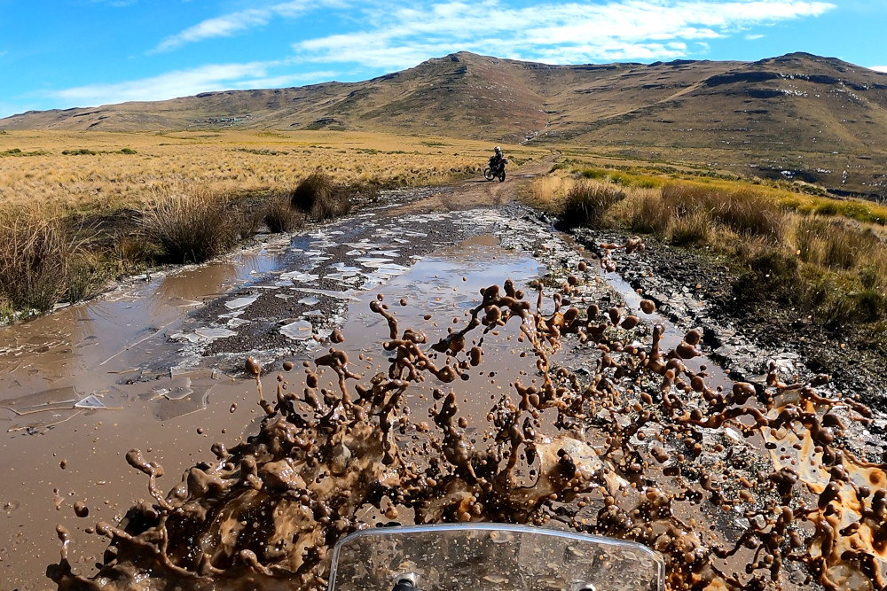 Since adventure bikers were coming from different parts of South Africa to ride the challenge, we’d arranged to meet in Lady Grey. As we met at the pub for dinner the evening before, soft rain started to fall. I feared it didn’t bode well. But through the course of the night the rain stopped and the next day dawned clear. However, all that rain had already soaked Joubert’s Pass at the start of our route. Sections of the track had changed into thick black mud – it was like wading through treacle.