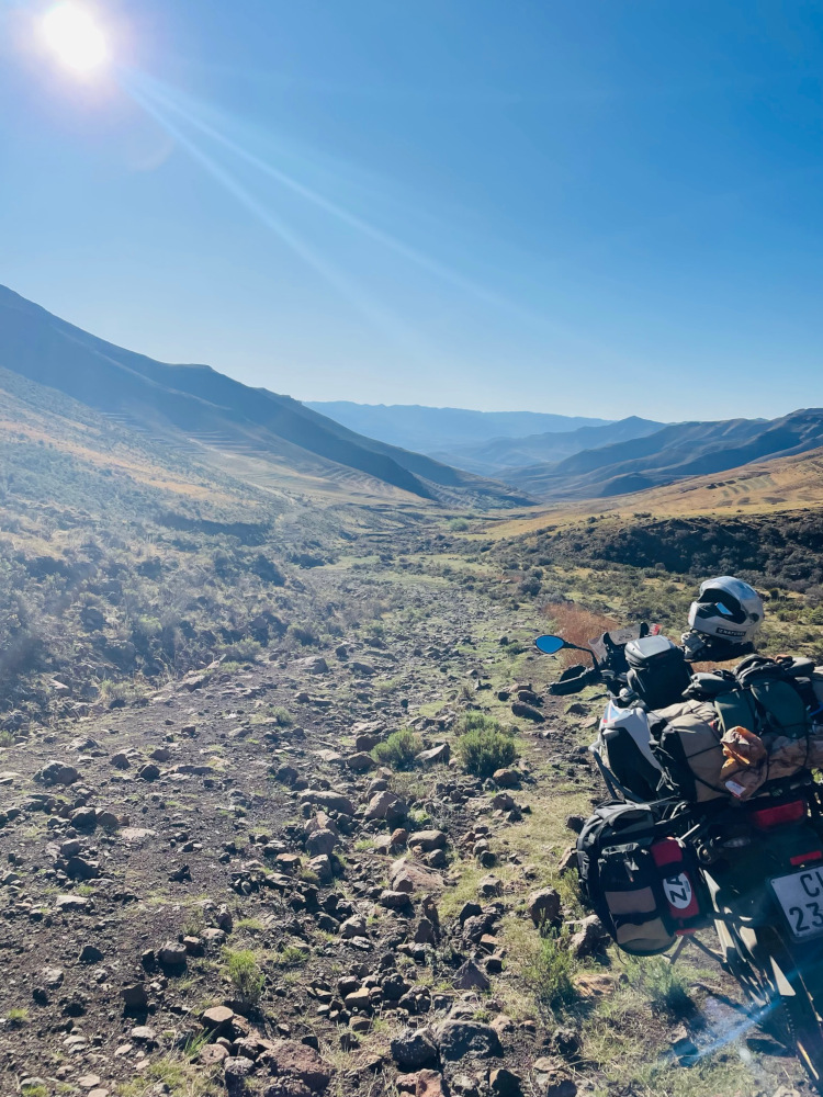 The first leg of Dawid’s ride took him along the Garden Route towards the Wild Coast. Magical mountain passes, the Tsitsikamma Forest and the Sunshine Coast unspooled before him. Then things got wild. He nearly lost his drone and getting it back involved multiple swims, he almost ran out of petrol and rain swept in. Slippery, muddy tracks led to Hole in the Wall and it took a long stretch of wet roads to reach Fraser Falls. Dawid then cut inland via Matatiele to reach Lesotho, where the biking was “like riding a mountain pass for the entire day”.