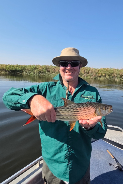 Once we’d set up our rods with the right lures, it soon became a competition between the two boats to see who could catch the most tiger fish. There were plenty of photos to take and I barely had a moment to open the book I had brought along to pass the time. Although there were a few quiet moments, every now and then chaos would erupt as yet another fish was on the line. It meant grabbing the net, landing the fish, unhooking it, holding it for a picture, releasing it back into the water and casting again. This is tiger fishing on the Okavango Delta!