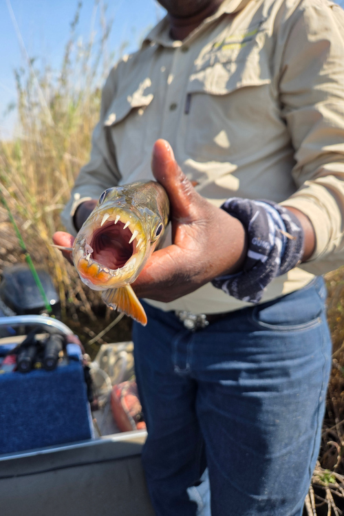 Our day got off to an exciting start at 7am as we set off on a speedboat cruise to reach the fishing spot. The two-hour boat ride was almost worth the trip alone. We crossed from one of the main channels running past Guma Lagoon, through various little papyrus-lined alleys to the next big main channel, where we would spend the rest of the day fishing. The sheer size of the crocodiles, the diversity of the birdlife, the hippos and the adrenaline of sitting in the front of the flat-bottomed aluminium boat had us spellbound.