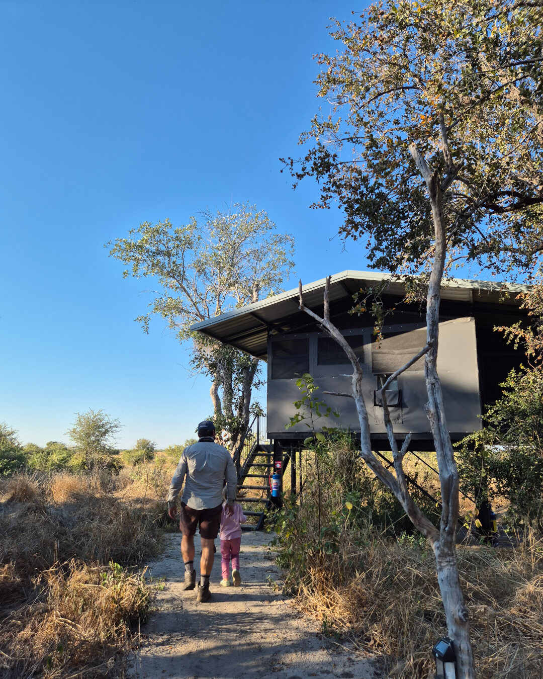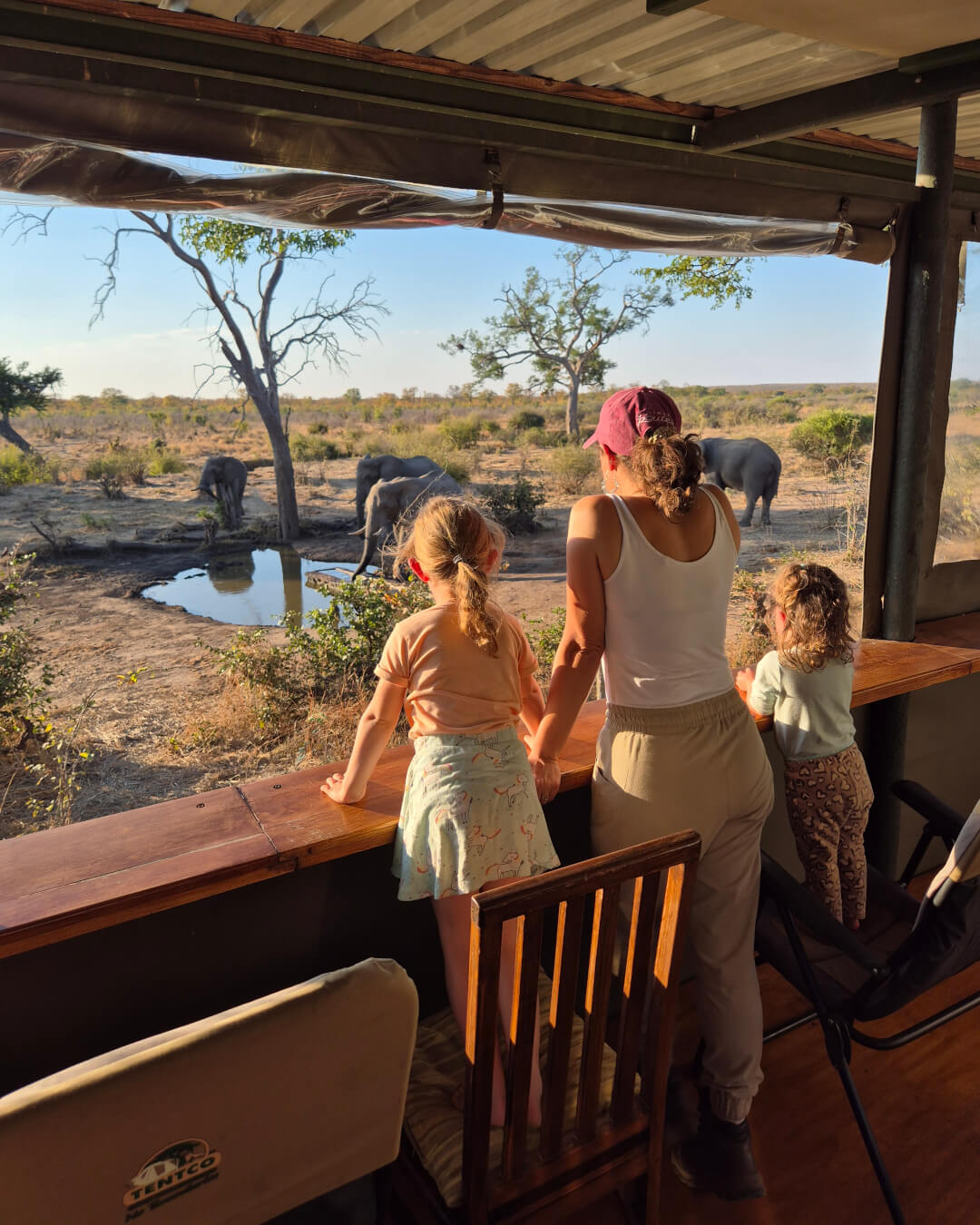 The platform was perfect for our family with young kids, but it would be just as ideal for a couple on honeymoon! The area is fenced and features an outdoor boma and braai, complete with a generous stack of firewood that made my husband’s day. There’s plenty of shade and shelter for all weather conditions. On the ground level is a bathroom and one small bedroom. The cherry on top: the platform’s upper level has a 360-degree view with a kitchen, queen bed (and space for 2 stretchers), a dining table and comfy chairs for game viewing – all overlooking your own private waterhole.