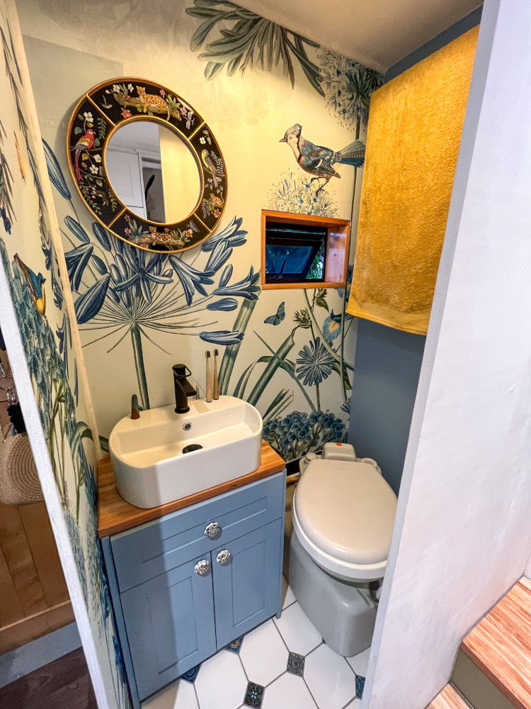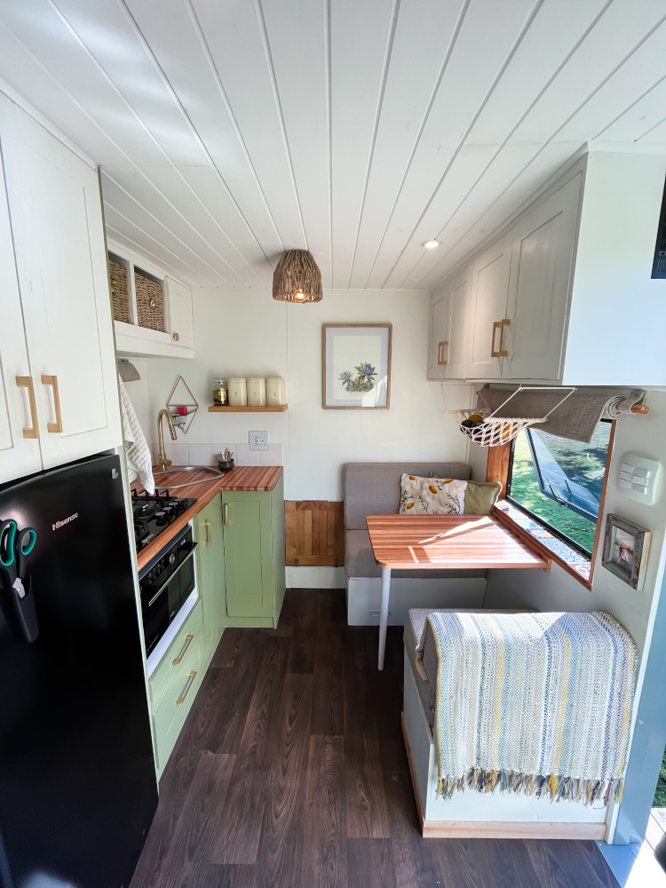 Instead of using stainless steel tanks for storing water, we opted for bladders. We have a 150-litre greywater system that catches water from the shower, bathroom basin and washing machine. We use this greywater to flush the toilet. Then we also have about 500-litres of fresh water, which hangs suspended from the box. That amount of water lasts us around two weeks.
