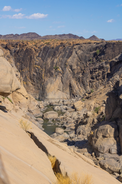 We couldn’t head to Namibia without seeing Augrabies Falls National Park on the way up. The day heated up quickly and the sun seemed unkind in this arid area. We stepped up to the falls, a 60m free-fall of natural power. In flood season, this spot gets more than three times the average high season flow rate of Niagara Falls. We were there in the dry season – a good time to get perspective on how much water that actually is! But the sun was climbing and we still had to traverse the rugged road to Riemvasmaak.